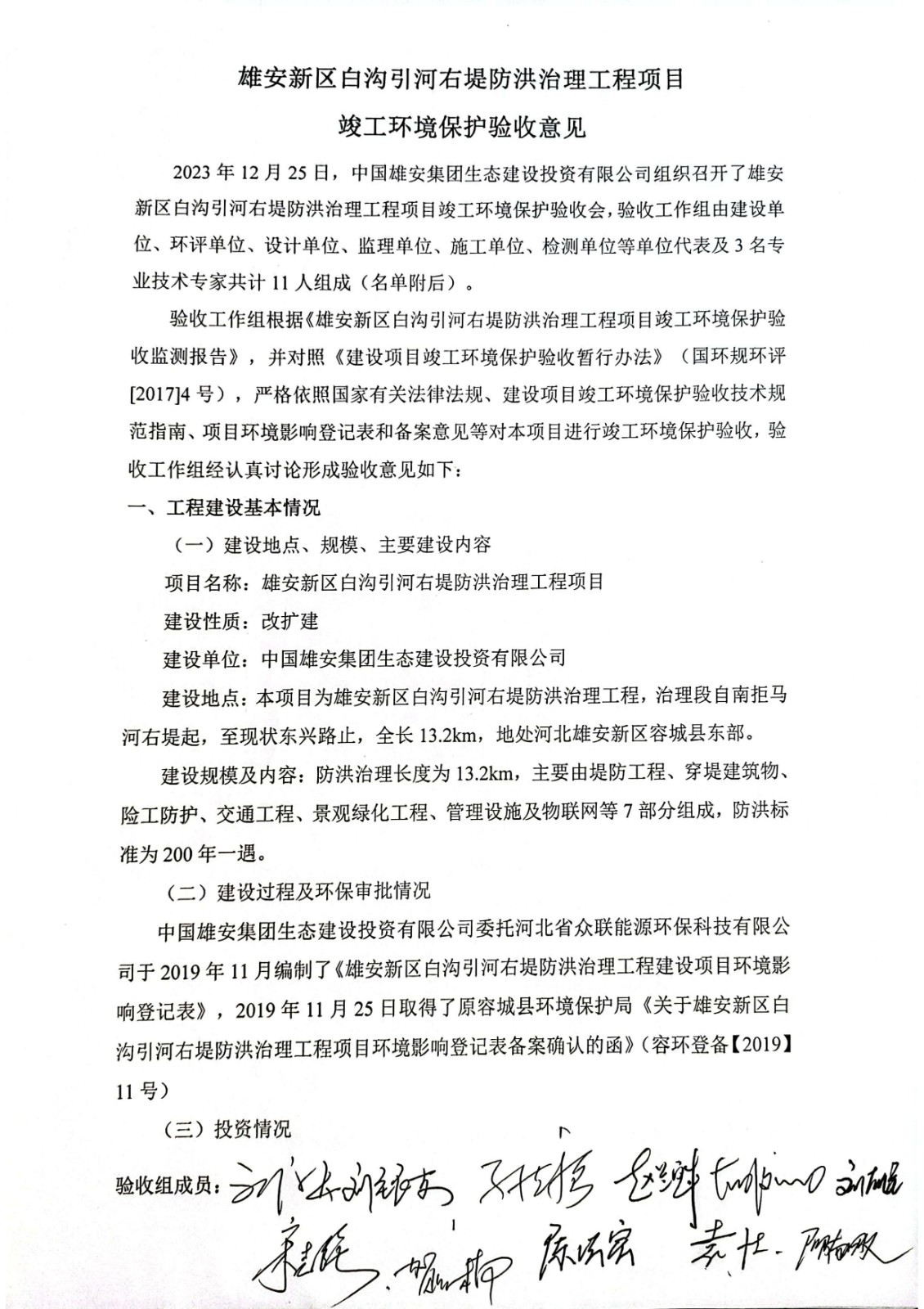 雄安新區白溝引河右堤防洪治理工程項目竣工環境保護驗收意見